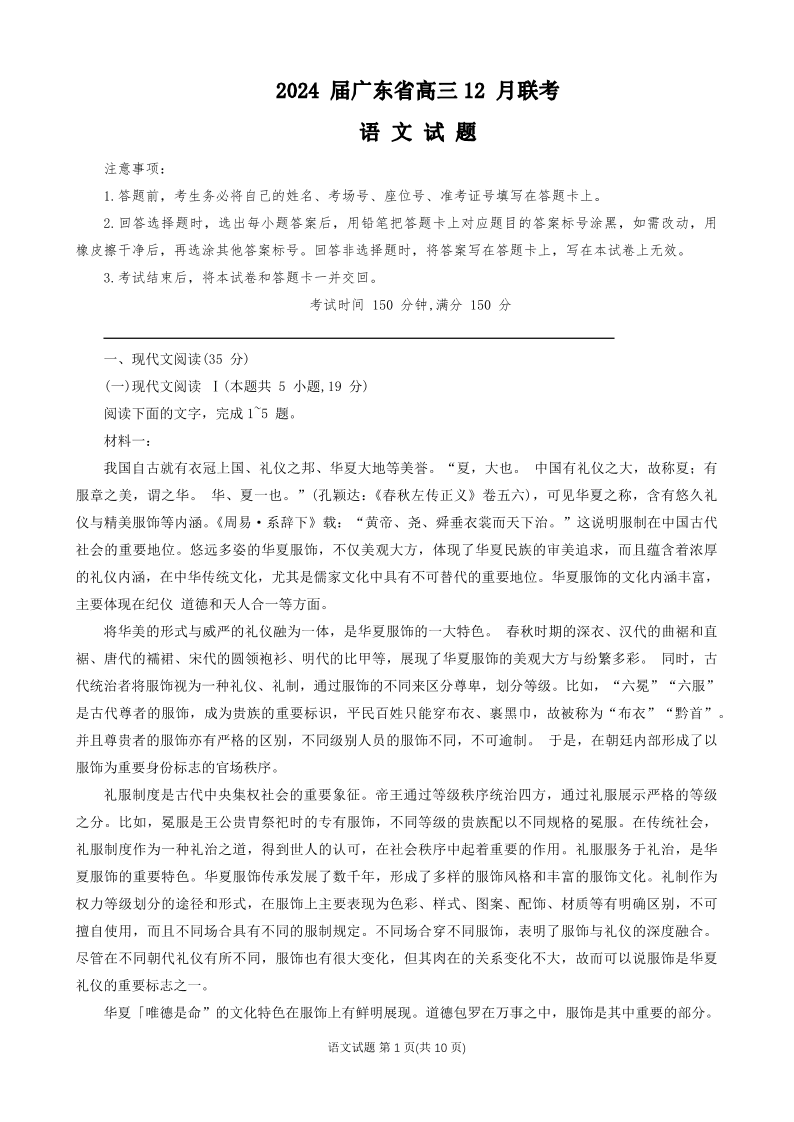 深圳外国语学校高中部2024届高三年级第四次月考 语文