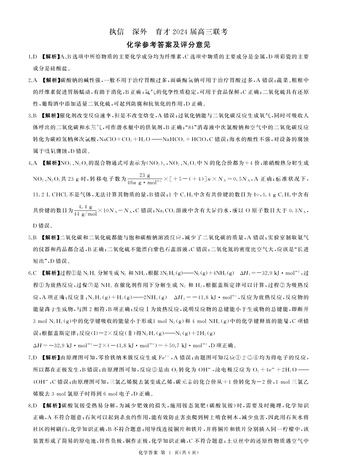 深圳外国语学校高中部2024届高三年级第四次月考 化学答案