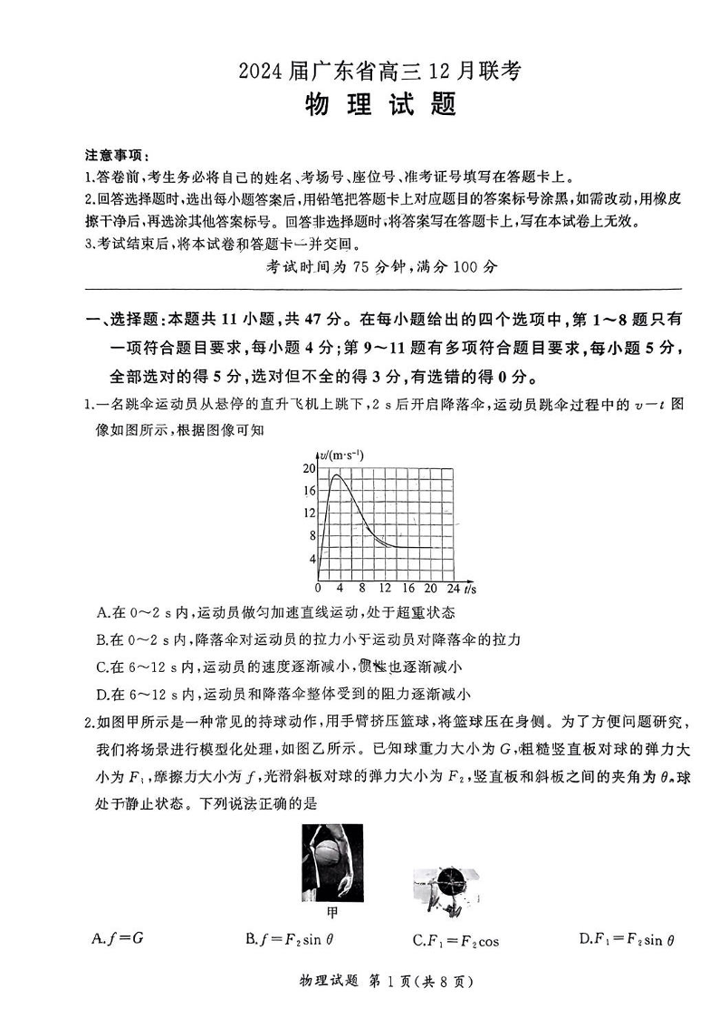 深圳外国语学校高中部2024届高三年级第四次月考 物理