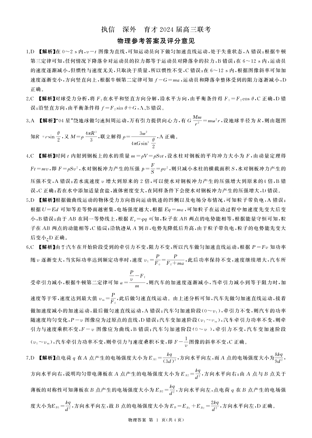 深圳外国语学校高中部2024届高三年级第四次月考 物理答案