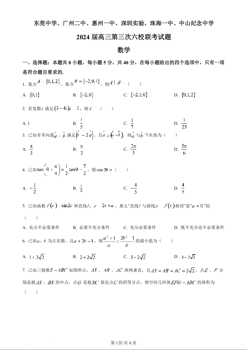 广东省东莞中学、广州二中、惠州一中、深圳实验、珠海一中、 中山纪念中学2024届高三第三次六校联考 数学