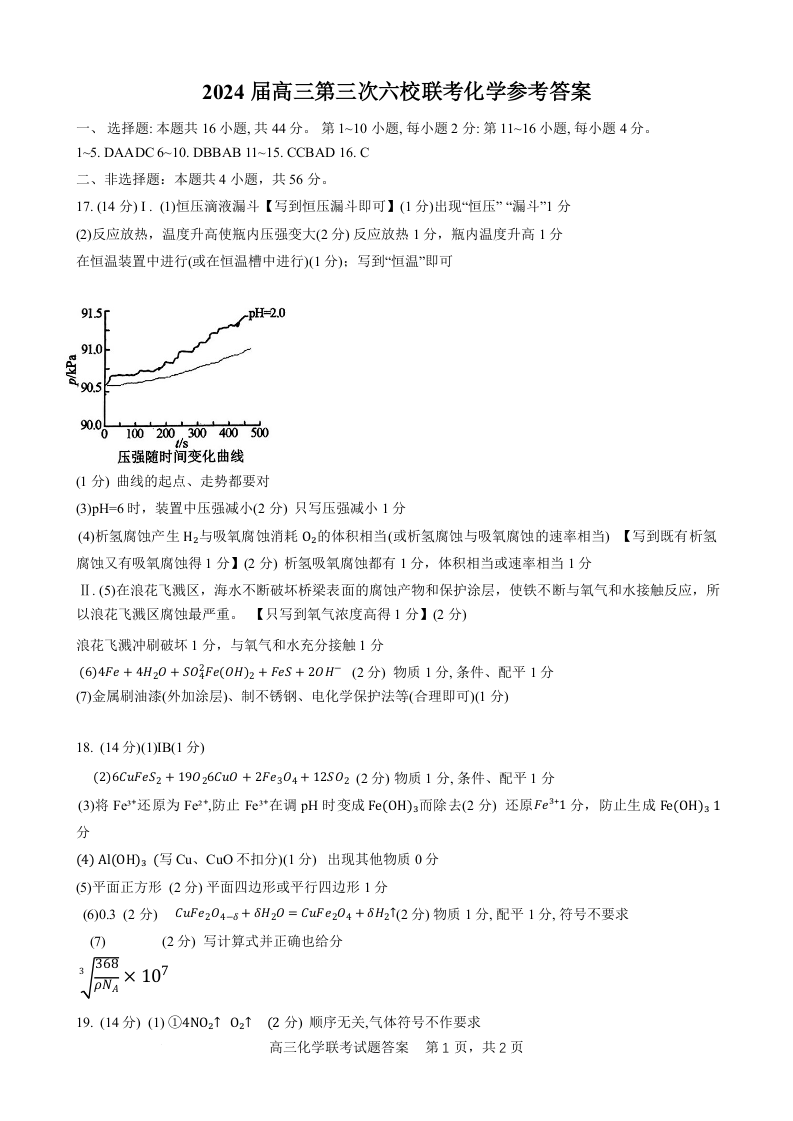 广东省东莞中学、广州二中、惠州一中、深圳实验、珠海一中、 中山纪念中学2024届高三第三次六校联考 化学答案