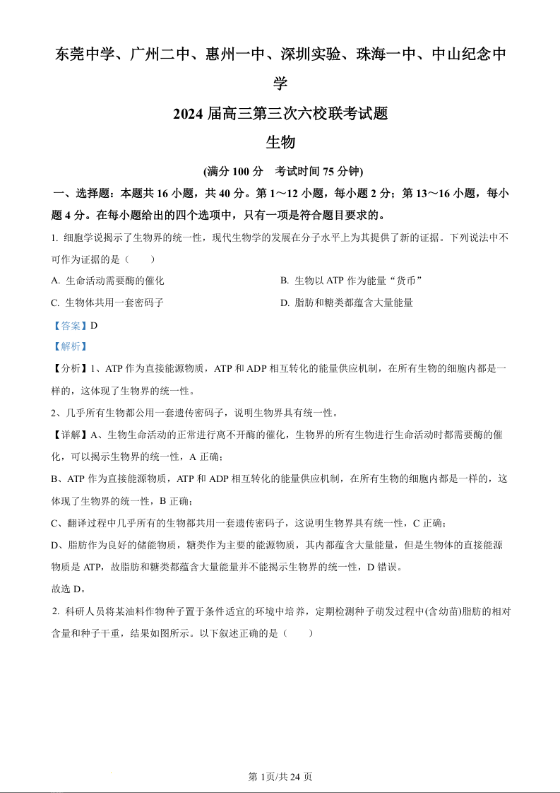 广东省东莞中学、广州二中、惠州一中、深圳实验、珠海一中、 中山纪念中学2024届高三第三次六校联考 生物答案