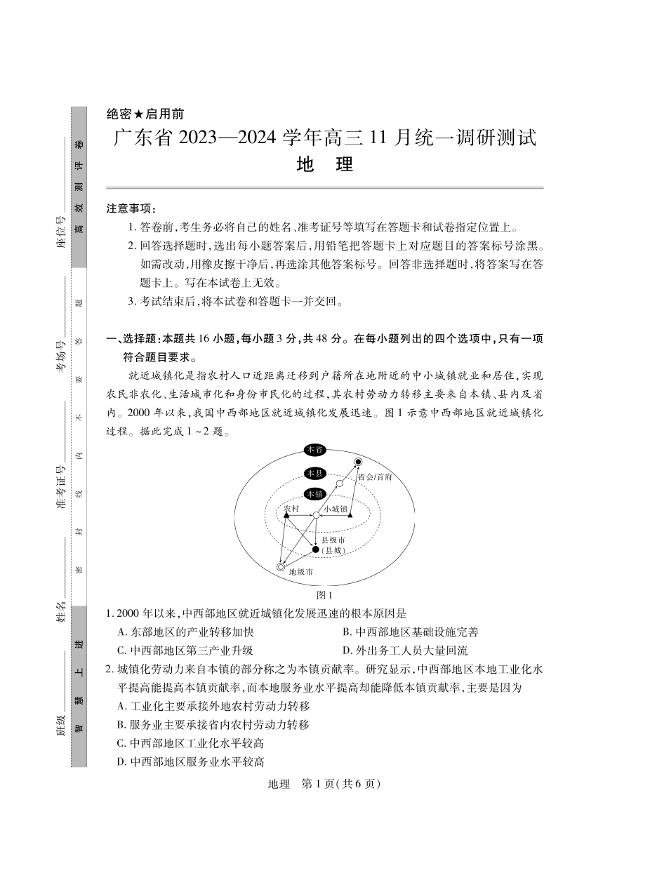 广东省2023-2024学年高三上学期12月统一调研考试 地理