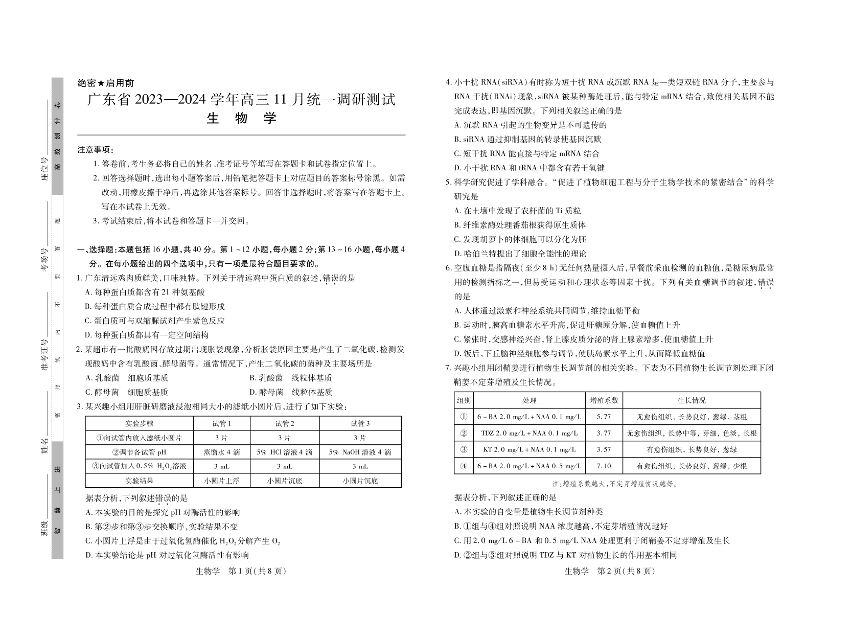 广东省2023-2024学年高三上学期12月统一调研考试 生物