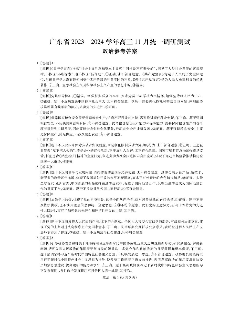 广东省2023-2024学年高三上学期12月统一调研考试 政治答案