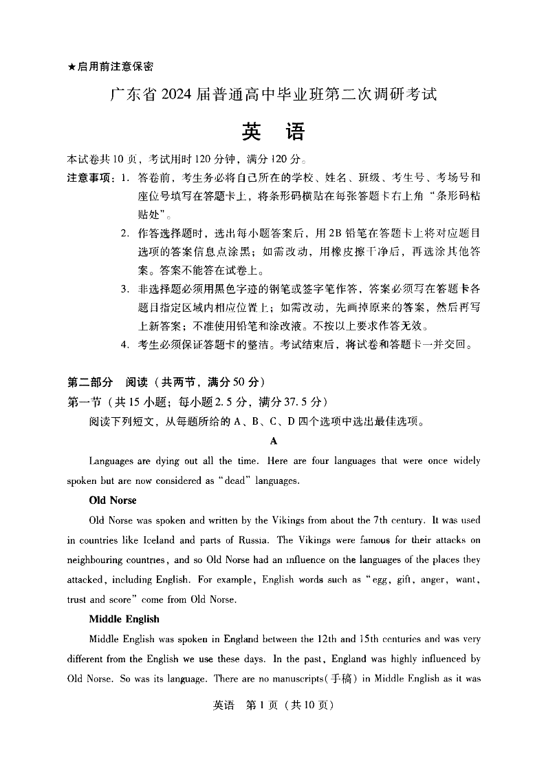广东省普通高中(粤光联考)2023-2024学年高三上学期第二次调研考试 英语