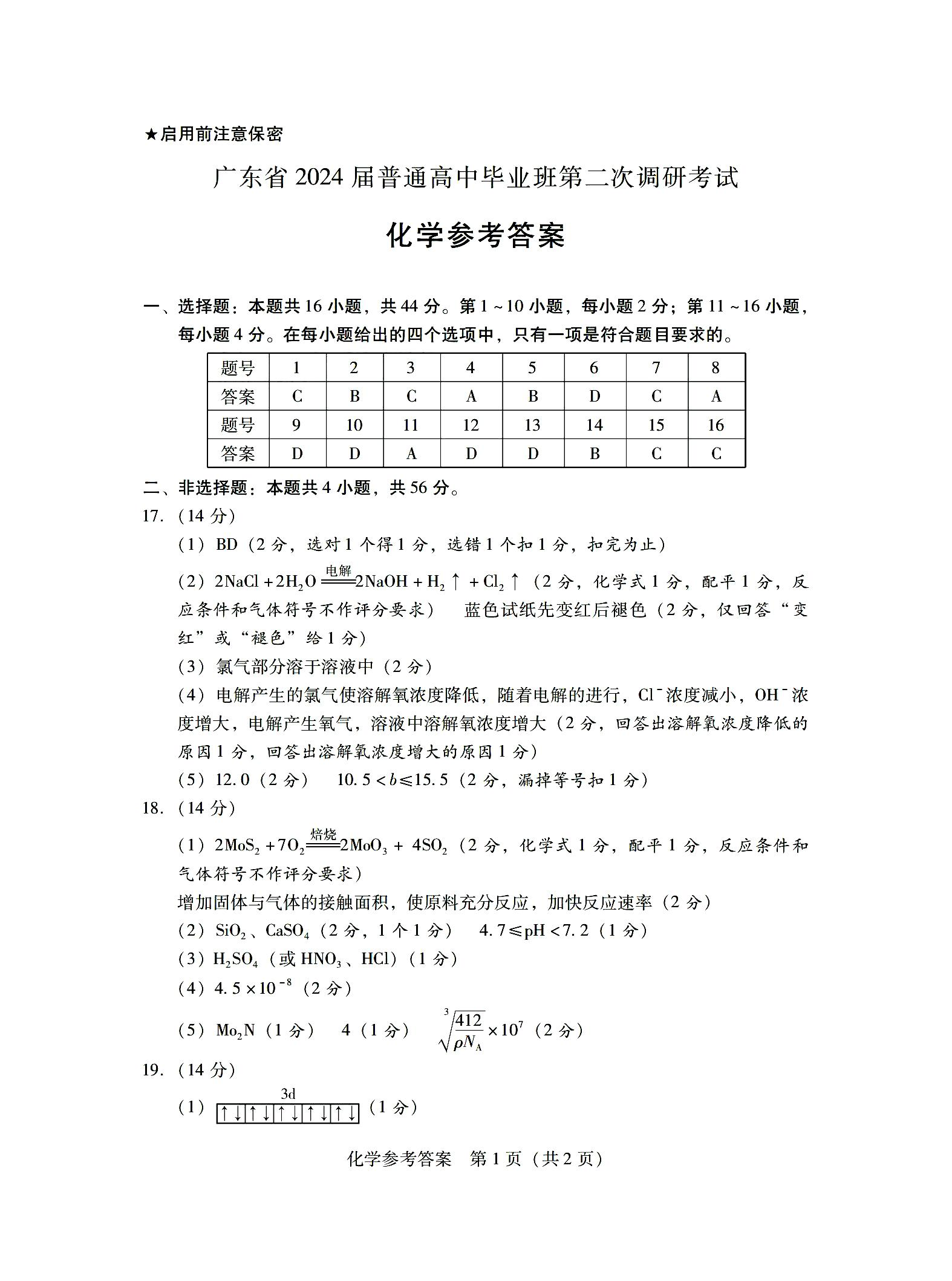 广东省普通高中(粤光联考)2023-2024学年高三上学期第二次调研考试 化学答案