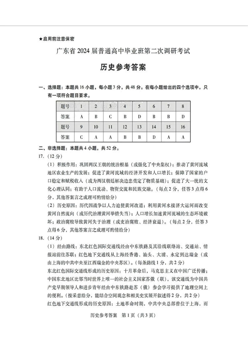 广东省普通高中(粤光联考)2023-2024学年高三上学期第二次调研考试 历史答案