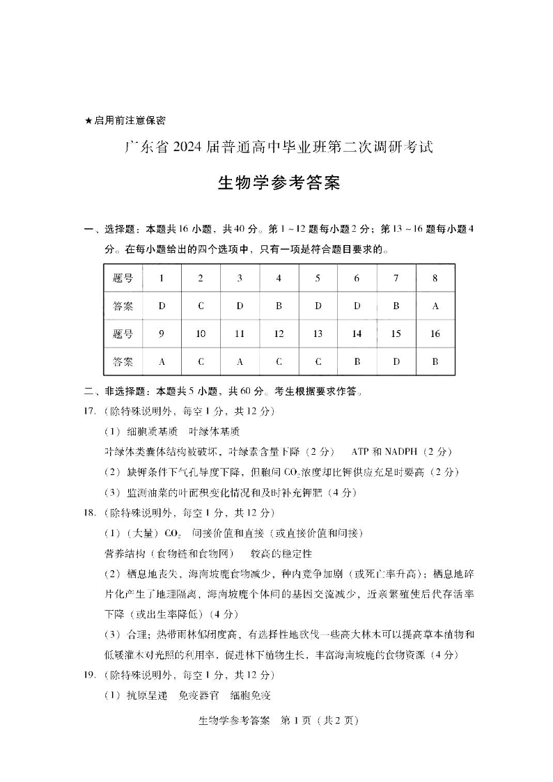 广东省普通高中(粤光联考)2023-2024学年高三上学期第二次调研考试 生物答案