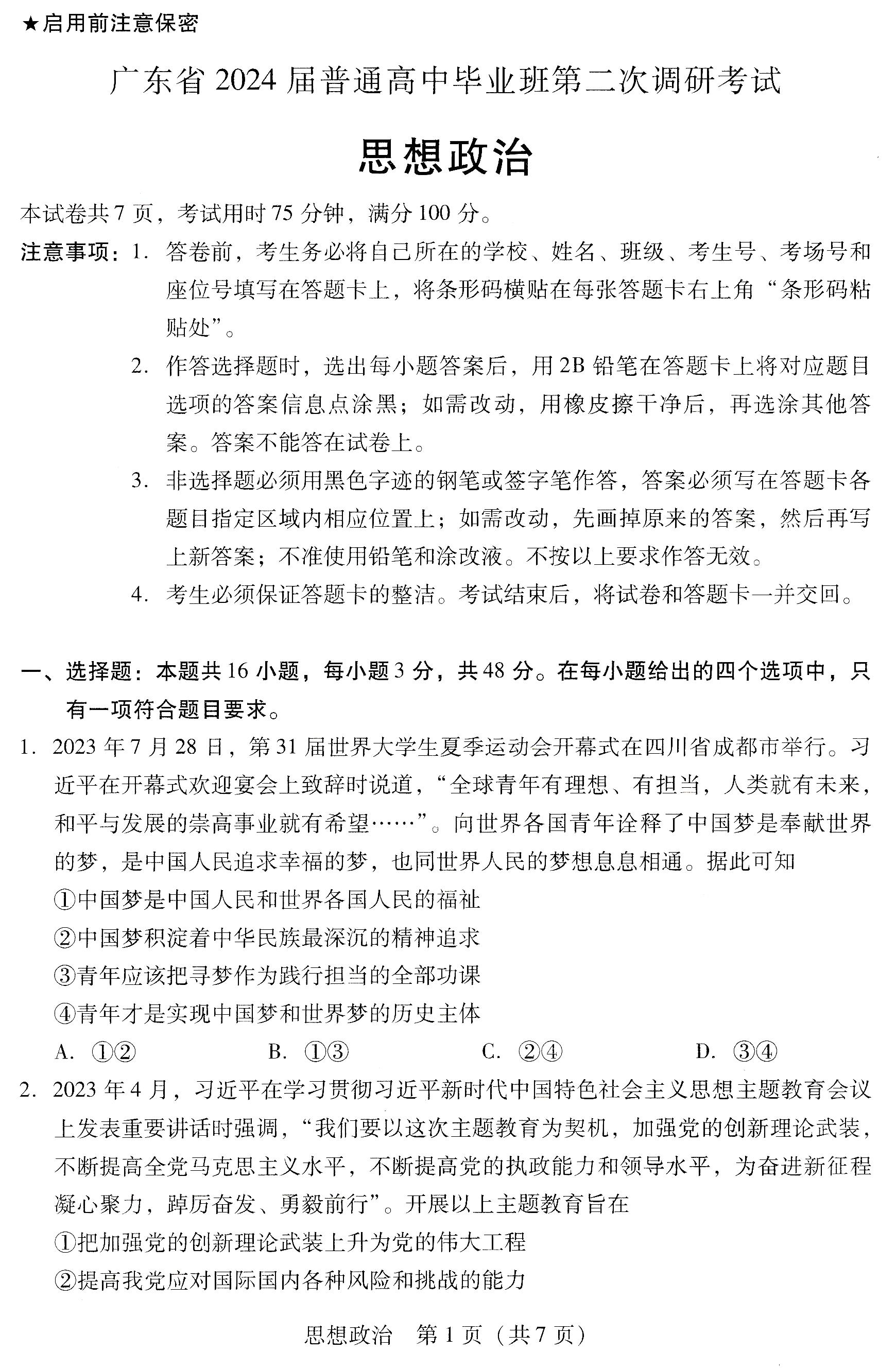 广东省普通高中(粤光联考)2023-2024学年高三上学期第二次调研考试 政治