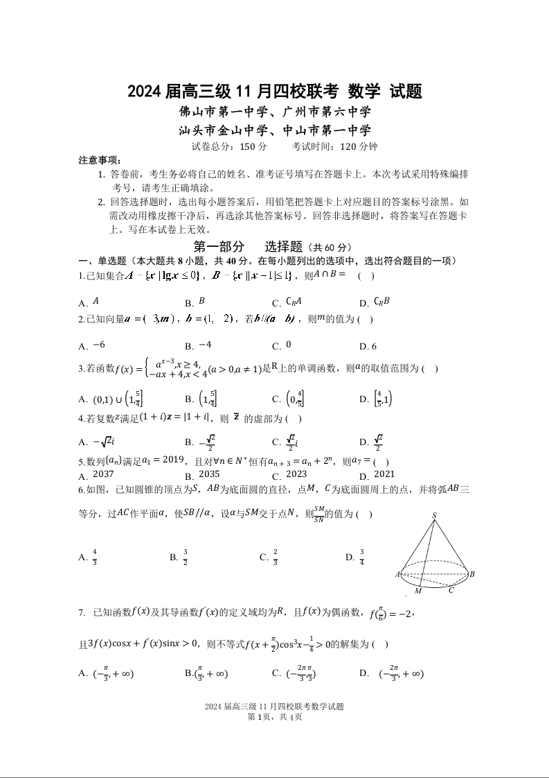 2024届高三级11月四校联考数学试题