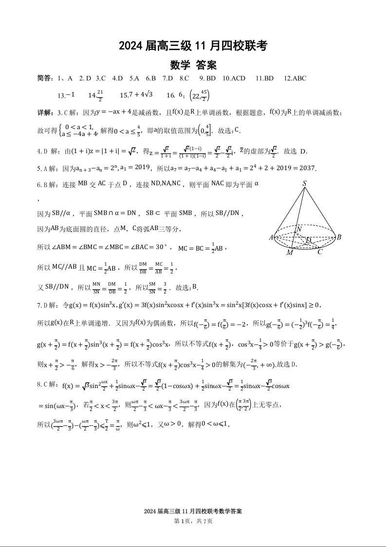 2024届高三级11月四校联考数学答案