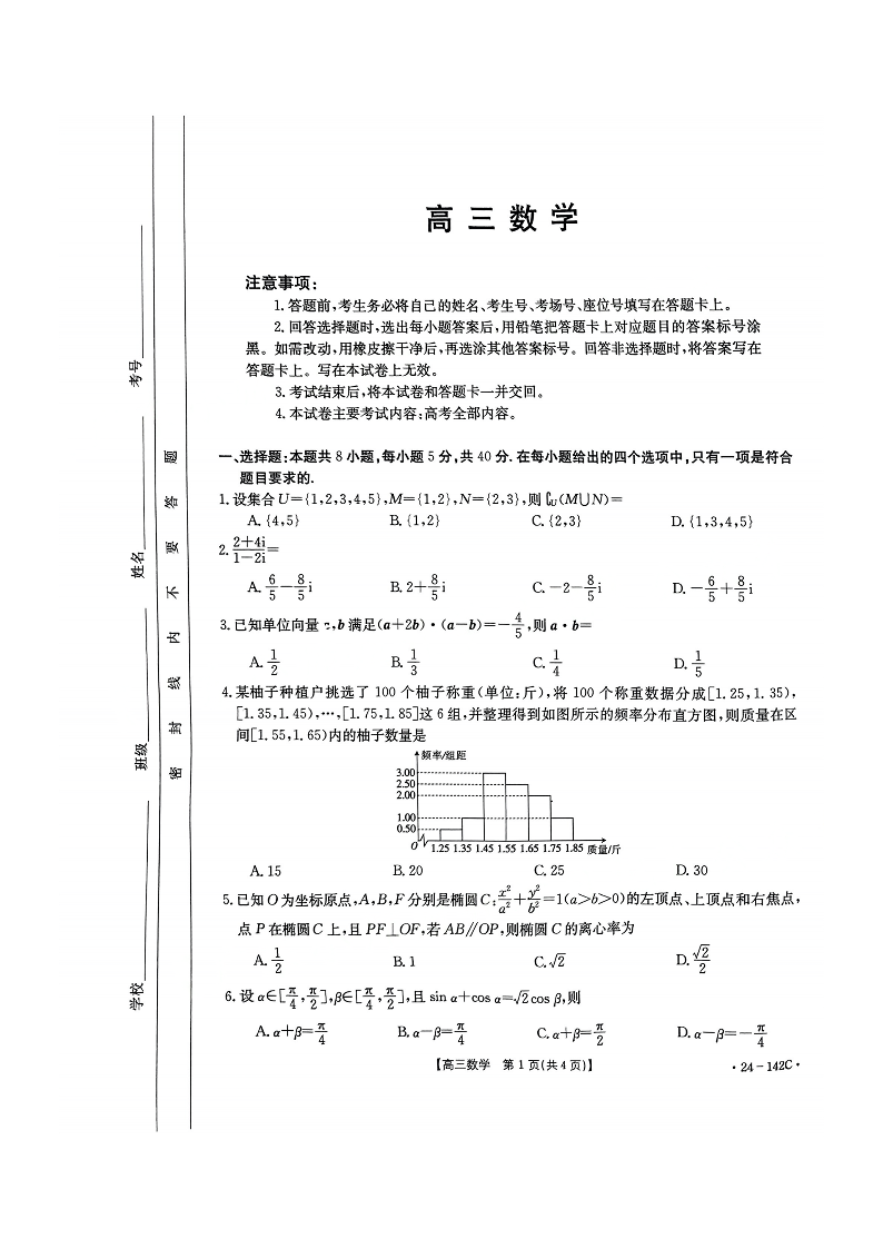 广东省部分学校2023-2024学年高三上学期11月大联考 数学