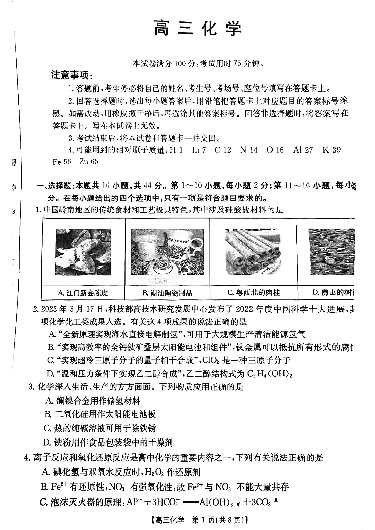 广东省部分学校2023-2024学年高三上学期11月大联考 化学