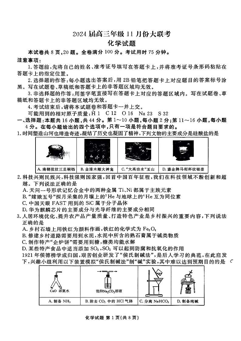广东衡水金卷2024届高三年级11月大联考 化学