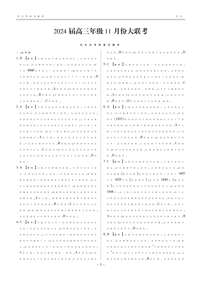 广东衡水金卷2024届高三年级11月大联考 历史答案