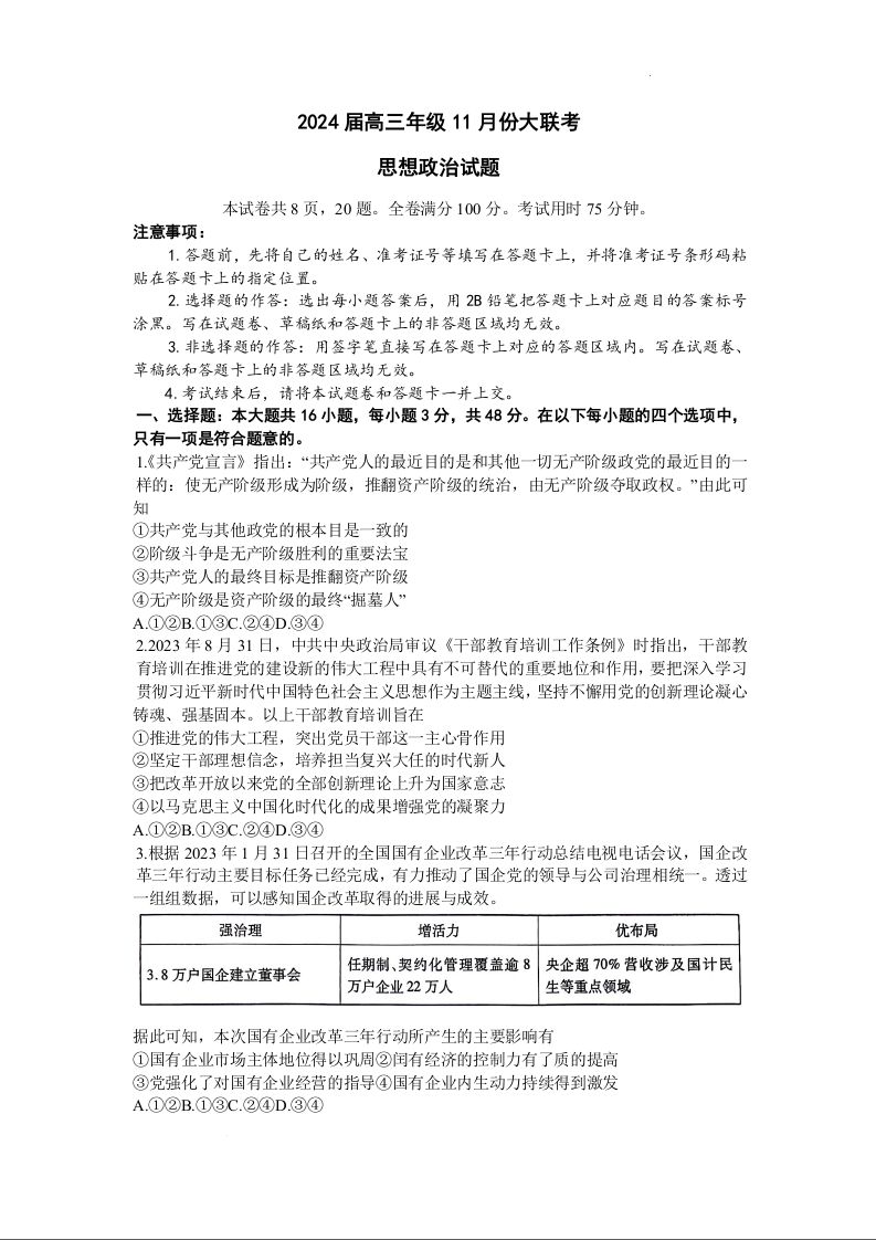 广东衡水金卷2024届高三年级11月大联考 政治
