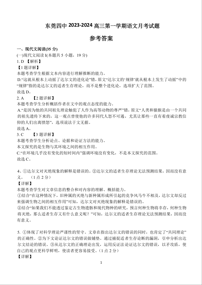 广东省东莞市第四中学2023-2024学年高三上学期10月月考 语文答案