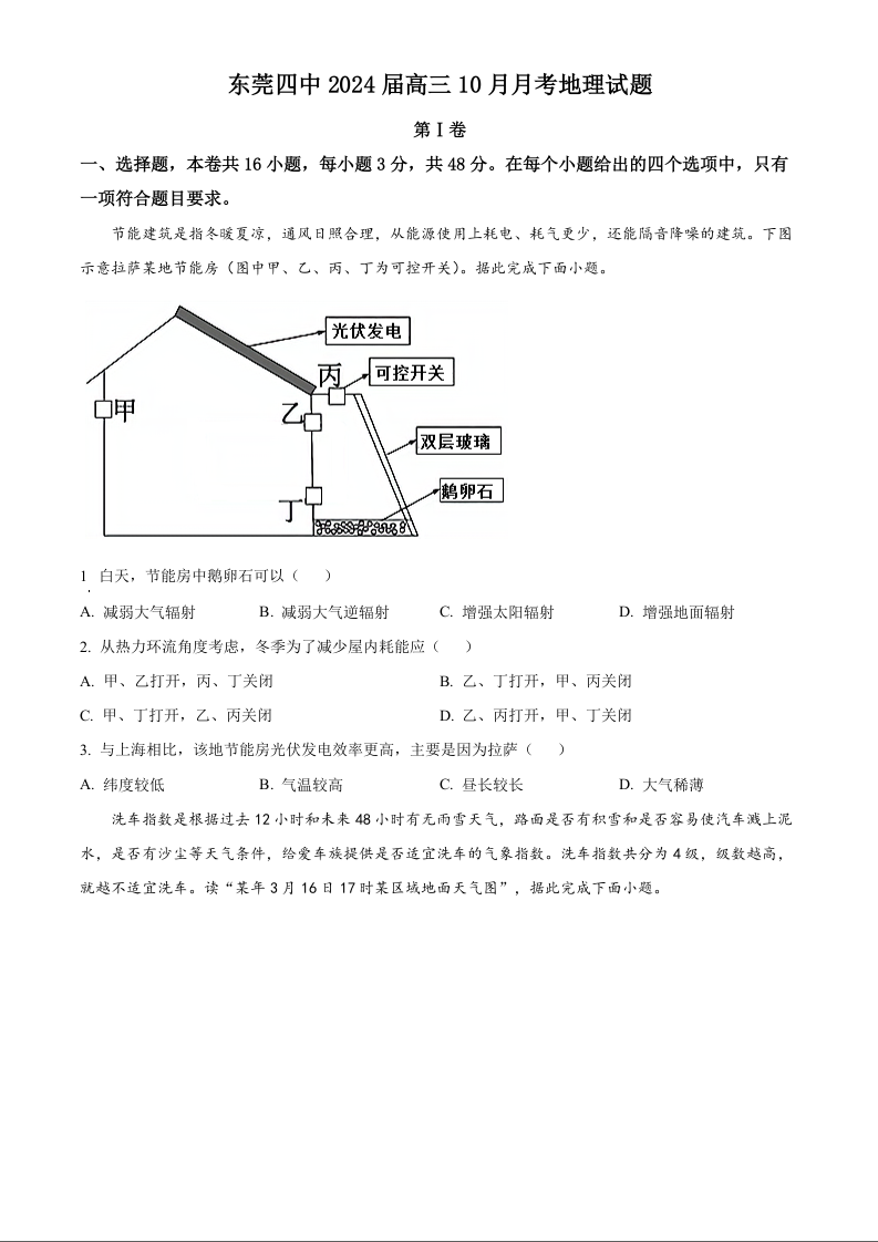 广东省东莞市第四中学2023-2024学年高三上学期10月月考 地理