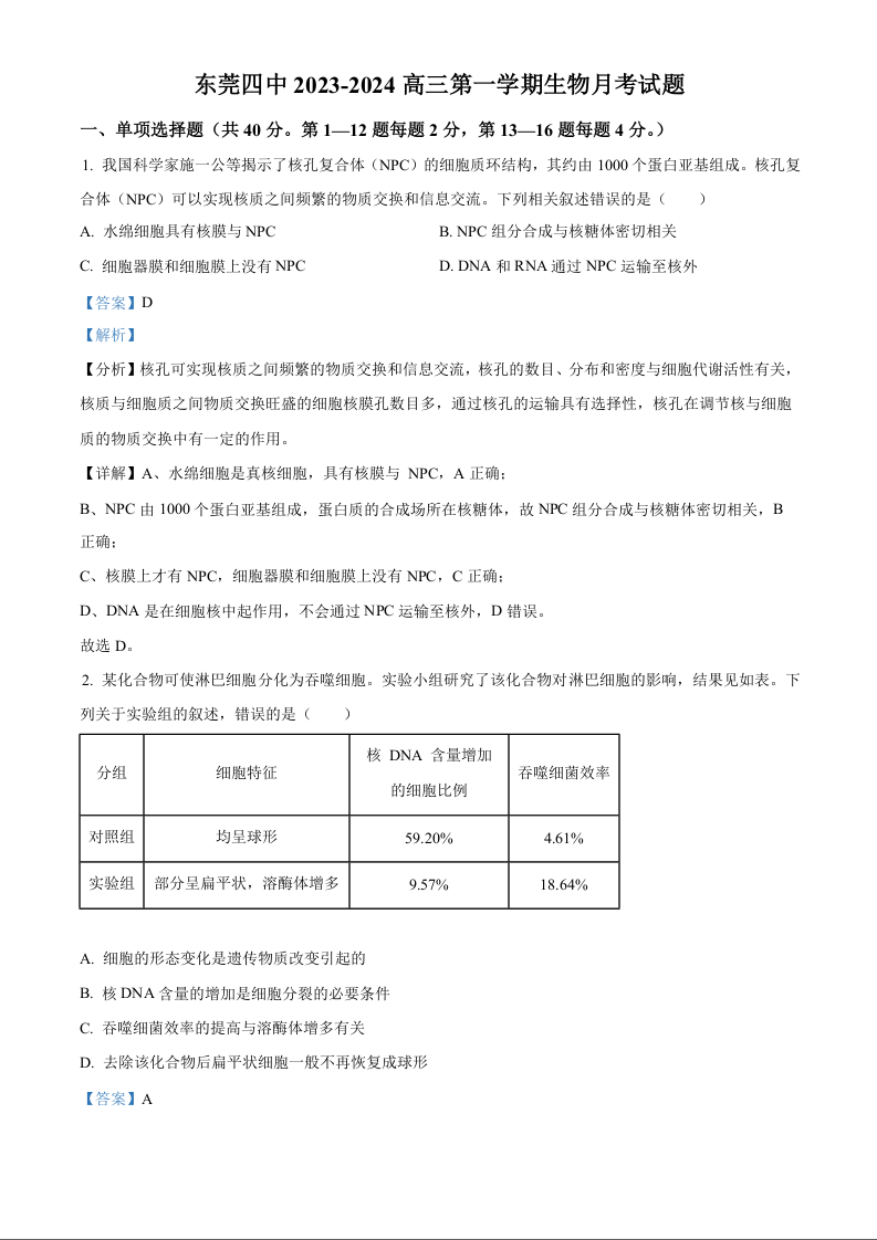 广东省东莞市第四中学2023-2024学年高三上学期10月月考 生物答案