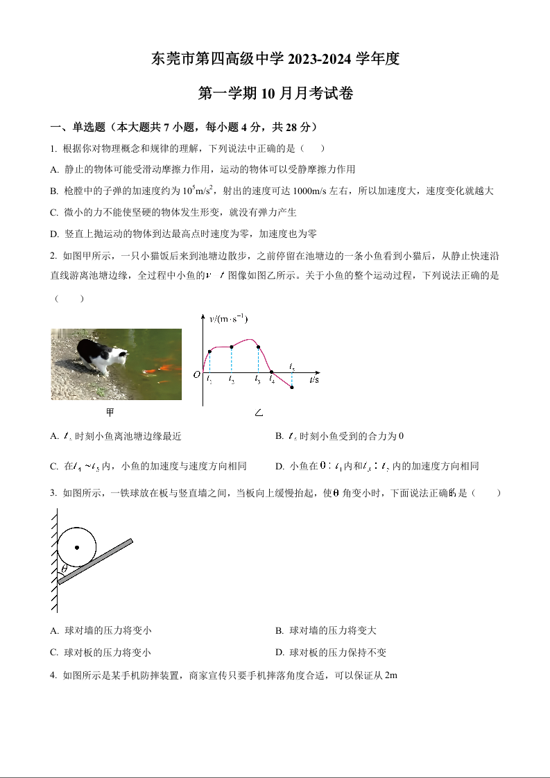 广东省东莞市第四中学2023-2024学年高三上学期10月月考 物理