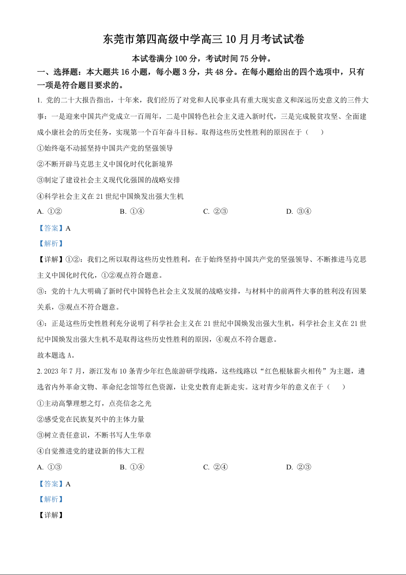 广东省东莞市第四中学2023-2024学年高三上学期10月月考 政治答案