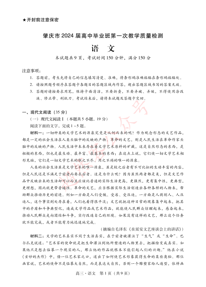 肇庆市2024届高三毕业班第一次教学质量检测 语文试卷
