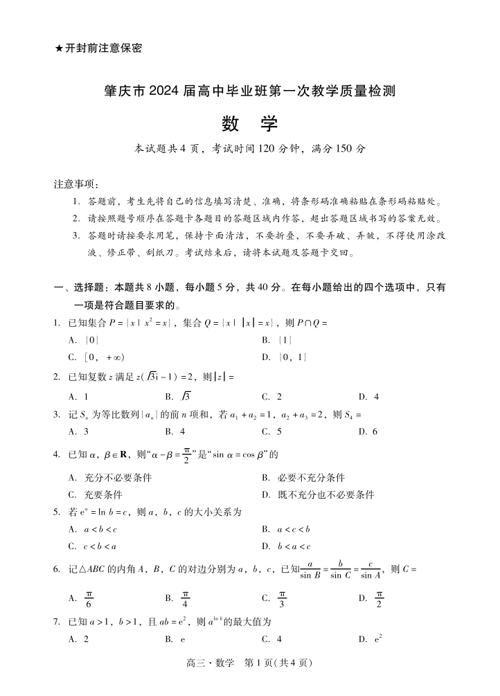 肇庆市2024届高三毕业班第一次教学质量检测 数学试卷