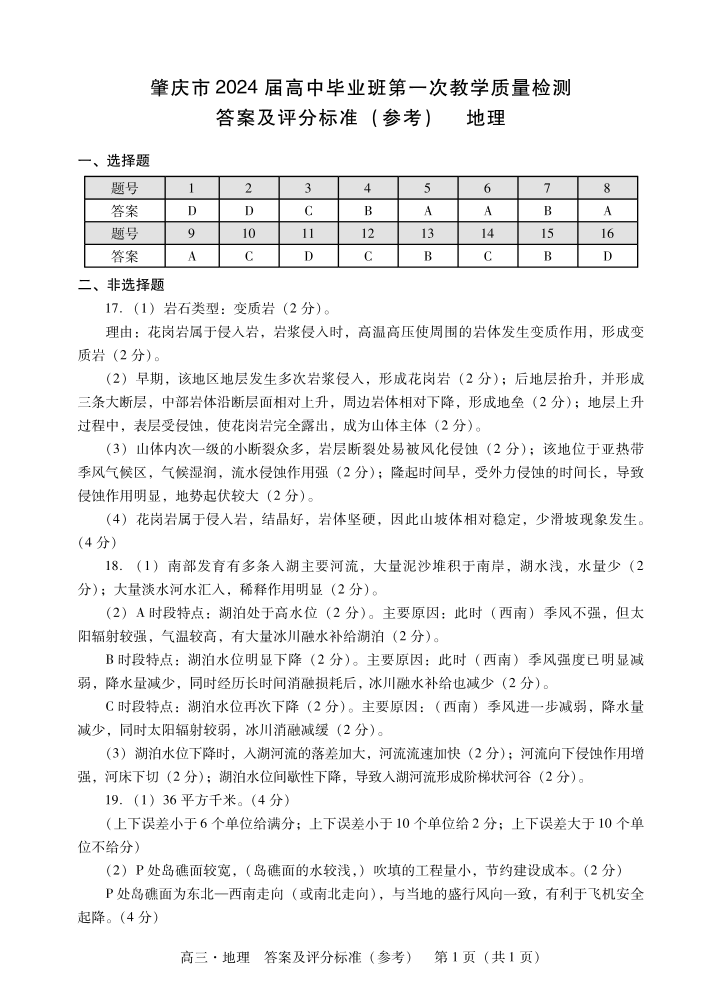 肇庆高三一测地理答案