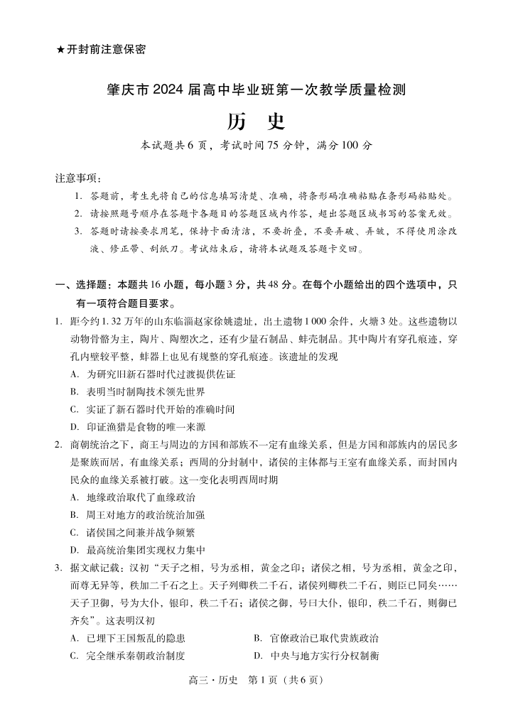 肇庆市2024届高三毕业班第一次教学质量检测 历史试卷