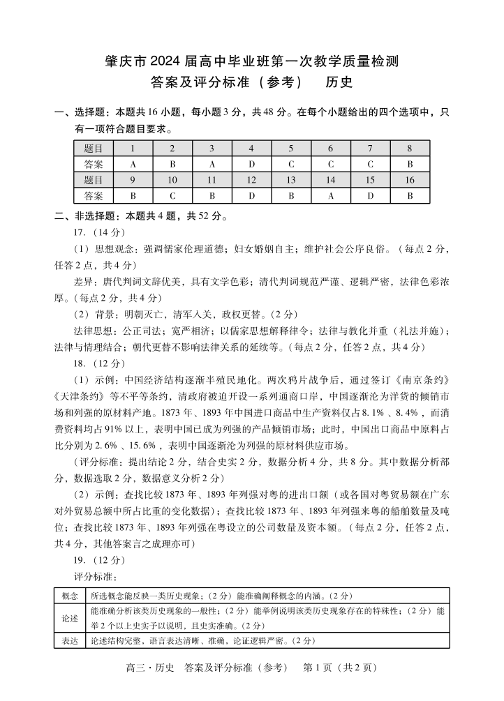 肇庆高三一测历史答案
