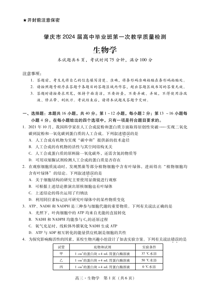 肇庆市2024届高三毕业班第一次教学质量检测 生物学试卷