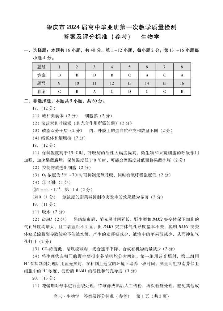 肇庆高三一测生物学答案