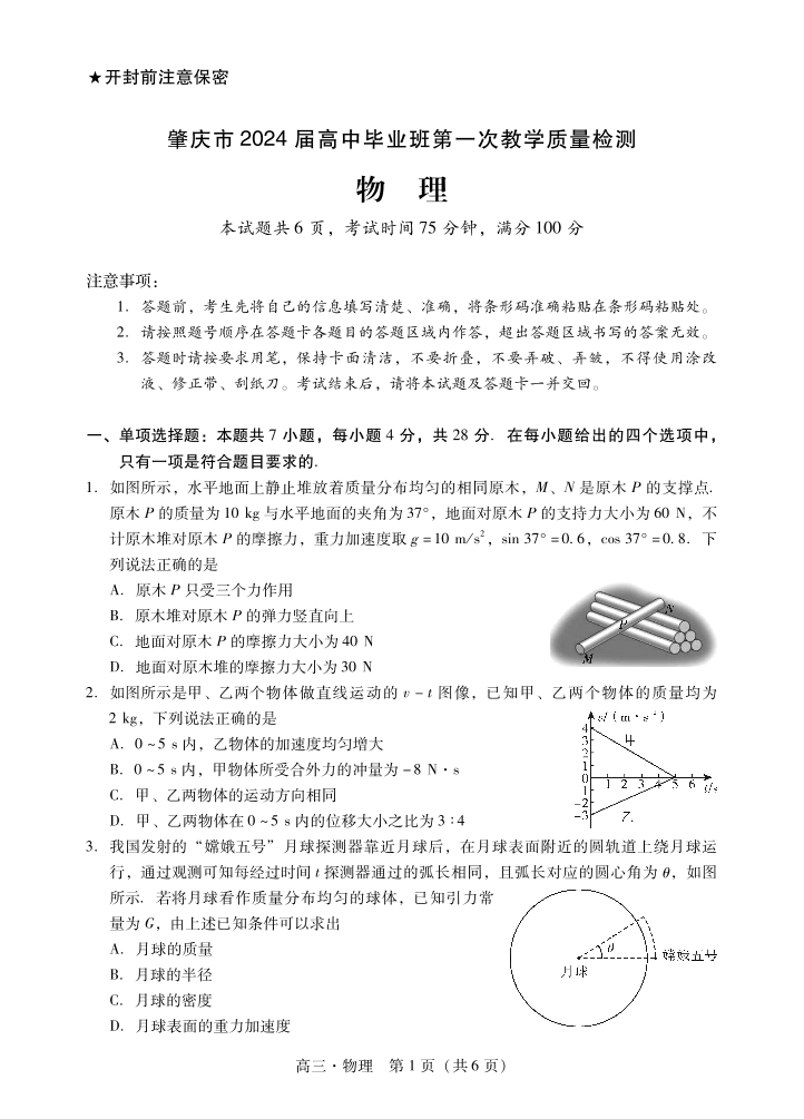 肇庆市2024届高三毕业班第一次教学质量检测 物理试卷