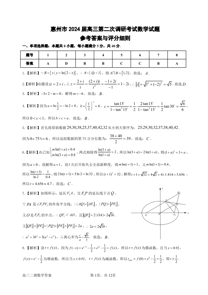 广东省惠州市2024届高三第二次调研考试 数学答案