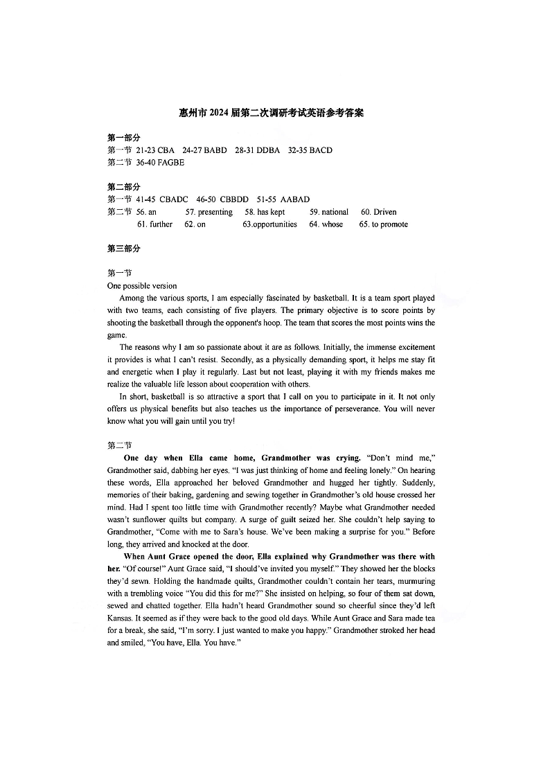 广东省惠州市2024届高三第二次调研考试 英语答案