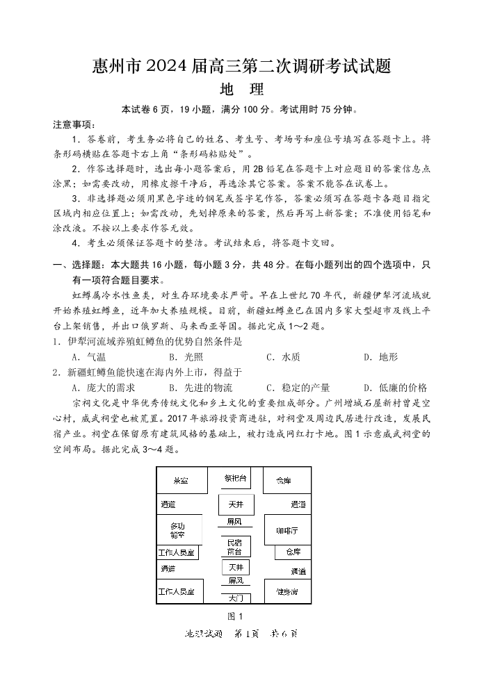 广东省惠州市2024届高三第二次调研考试 地理