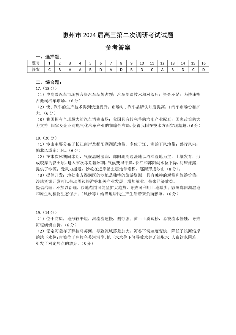 广东省惠州市2024届高三第二次调研考试 地理答案