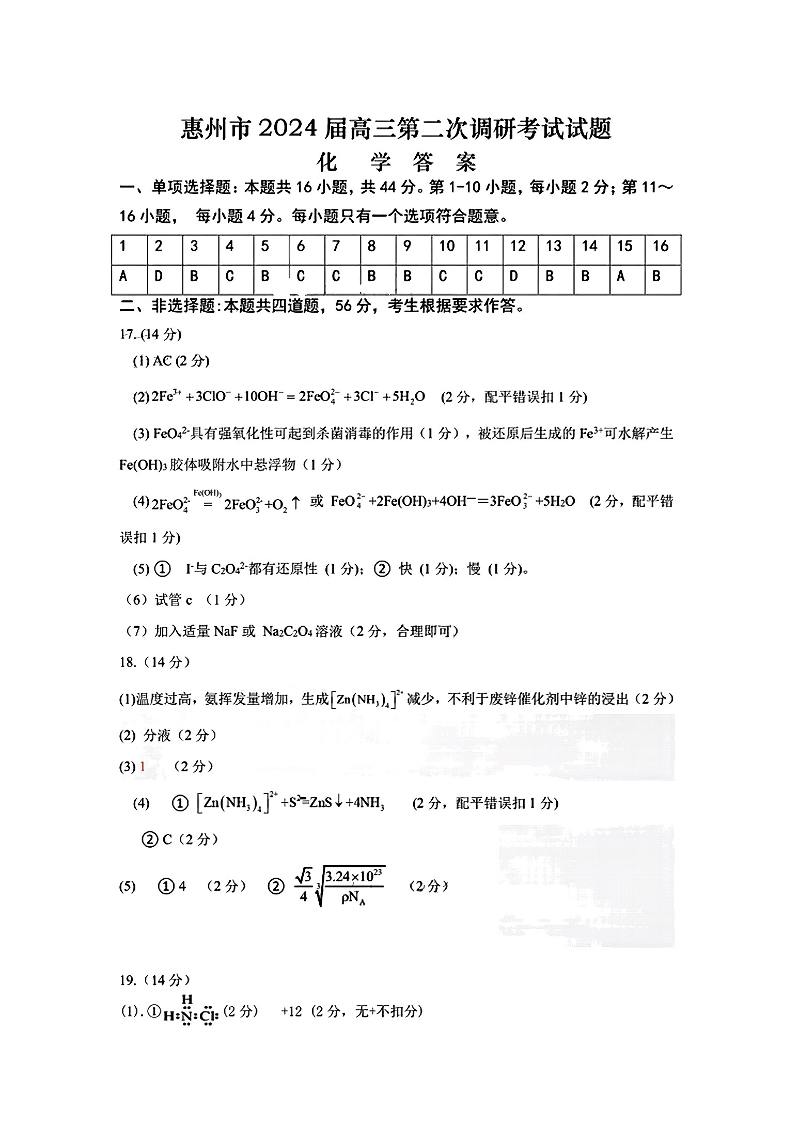 广东省惠州市2024届高三第二次调研考试 化学答案
