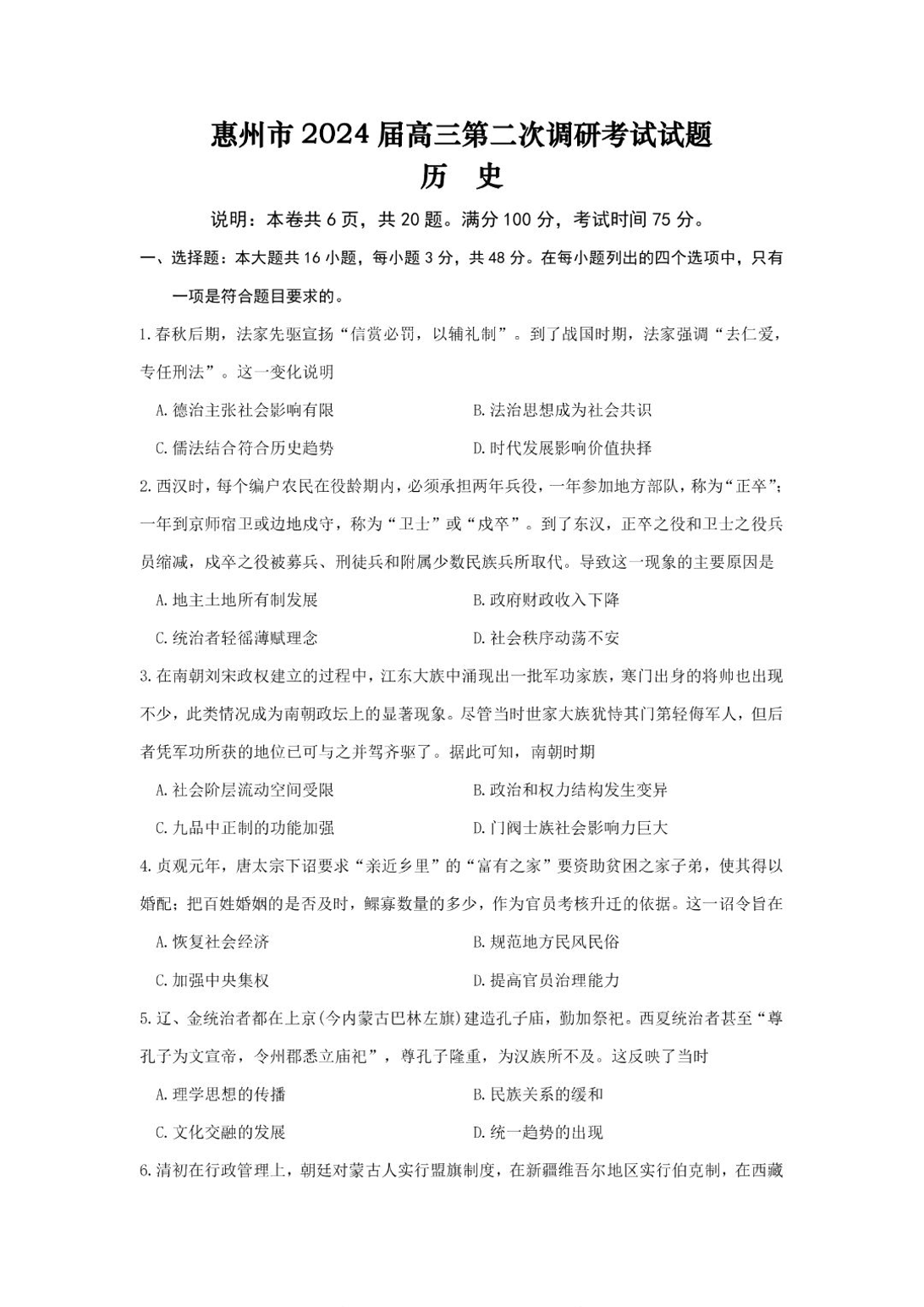 广东省惠州市2024届高三第二次调研考试 历史