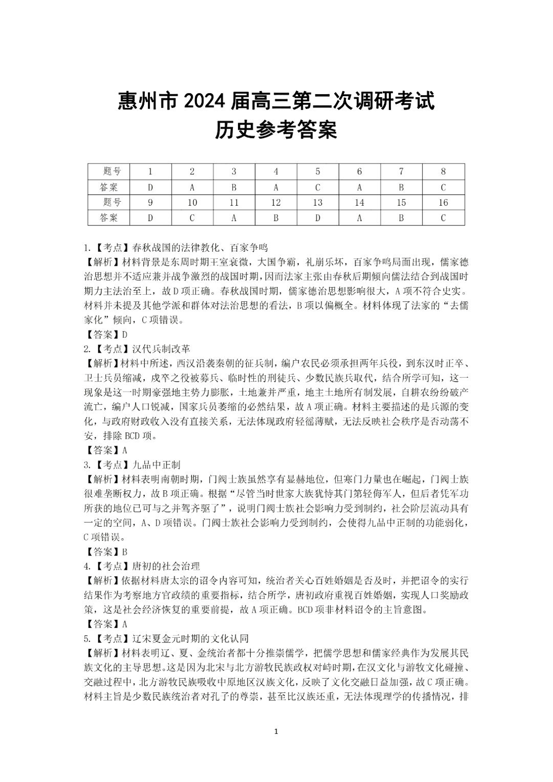 广东省惠州市2024届高三第二次调研考试 历史答案