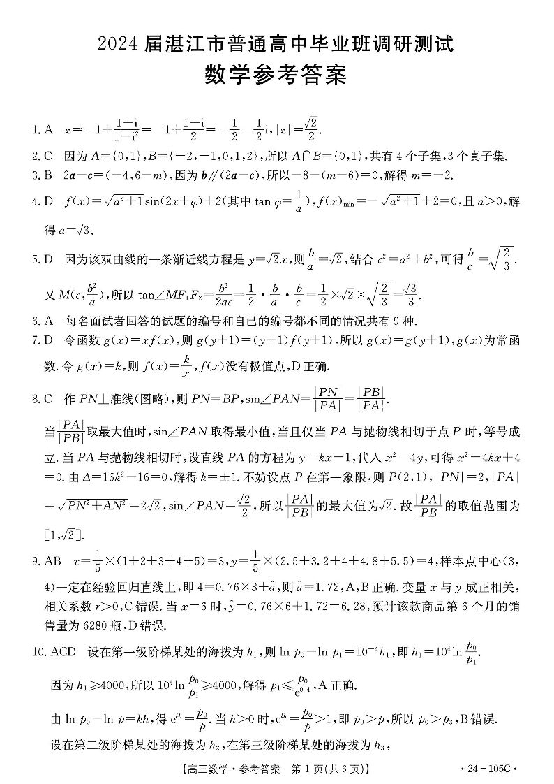 广东省湛江市普通高中2023-2024学年高三上学期10月调研考试 数学答案