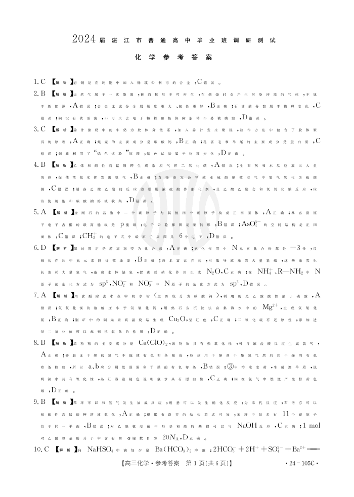 广东省湛江市普通高中2023-2024学年高三上学期10月调研考试 化学答案