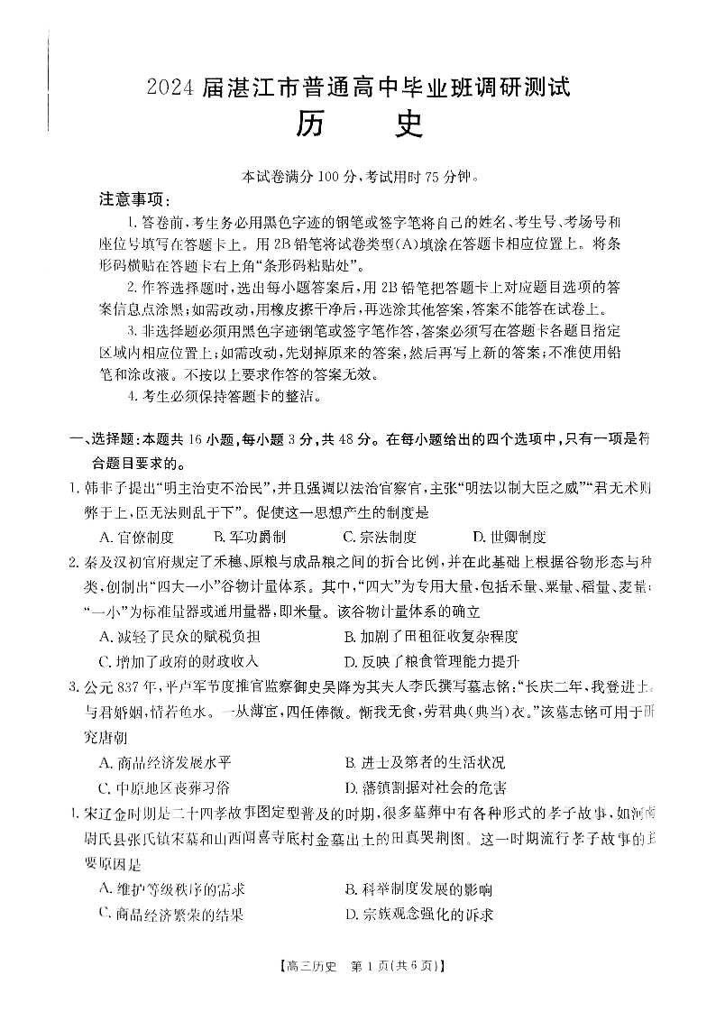广东省湛江市普通高中2023-2024学年高三上学期10月调研考试 历史