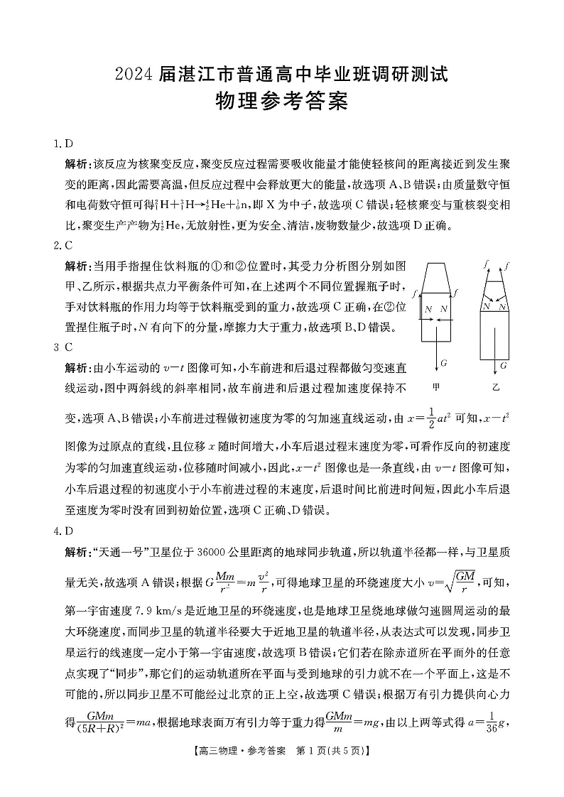 广东省湛江市普通高中2023-2024学年高三上学期10月调研考试 物理答案
