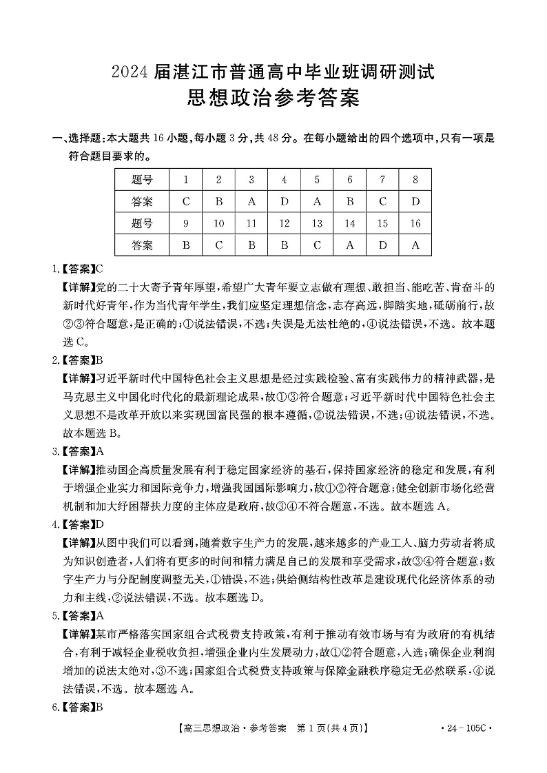广东省湛江市普通高中2023-2024学年高三上学期10月调研考试 政治答案