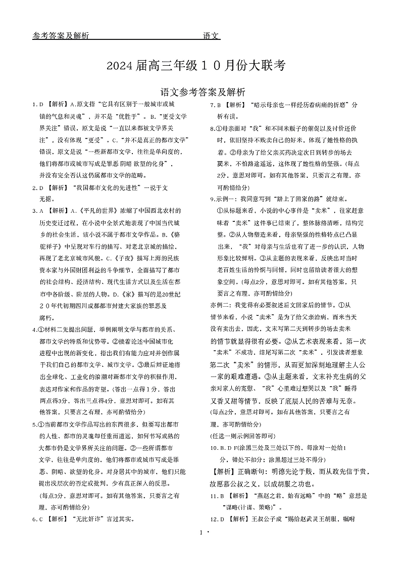 广东省衡水金卷2023-2024学年高三上学期10月份大联考 语文答案