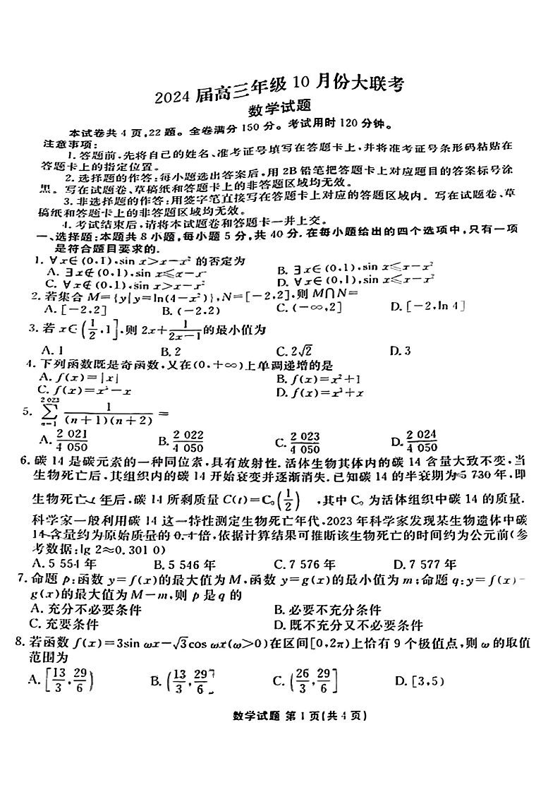 广东省衡水金卷2023-2024学年高三上学期10月份大联考 数学