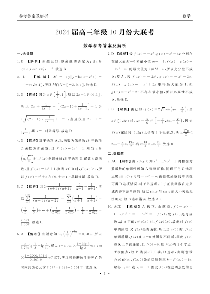 广东省衡水金卷2023-2024学年高三上学期10月份大联考 数学答案